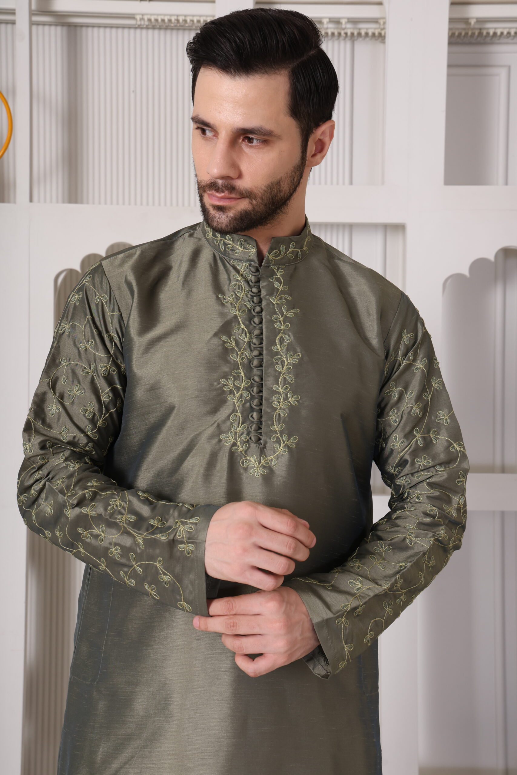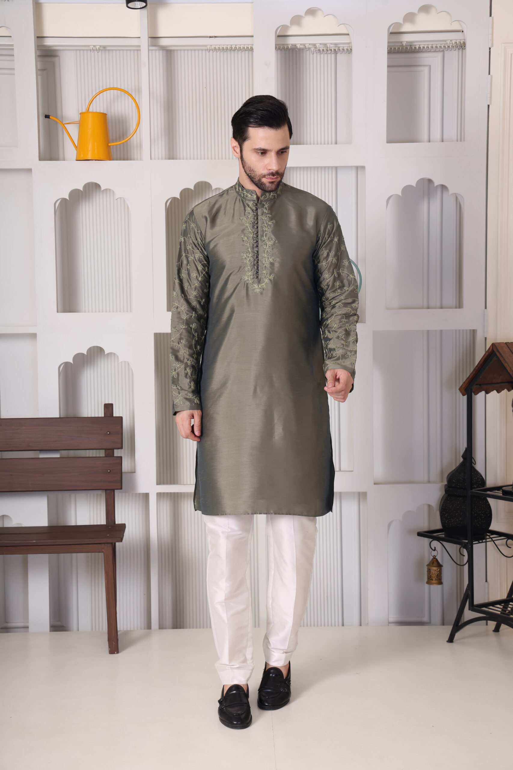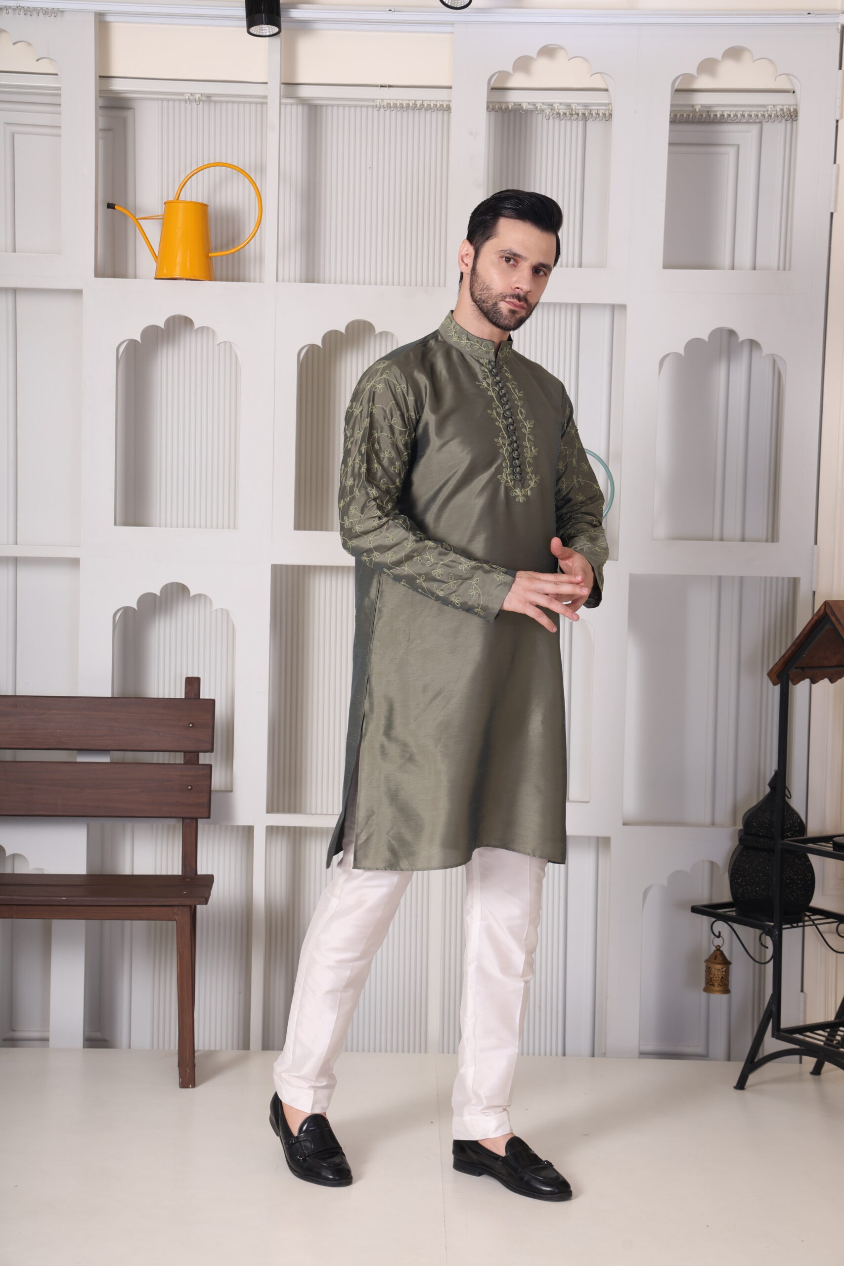 Understated sophistication meets timeless craftsmanship in this Olive Green Hand-Embroidered Silk Kurta Set by Aanujj Kapoor.