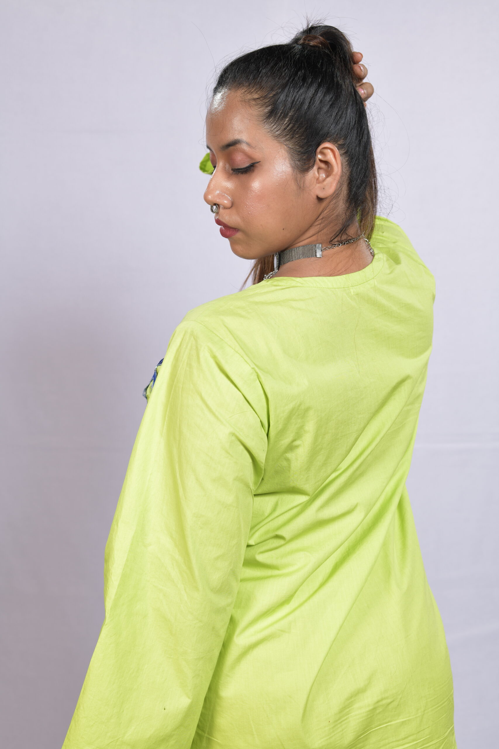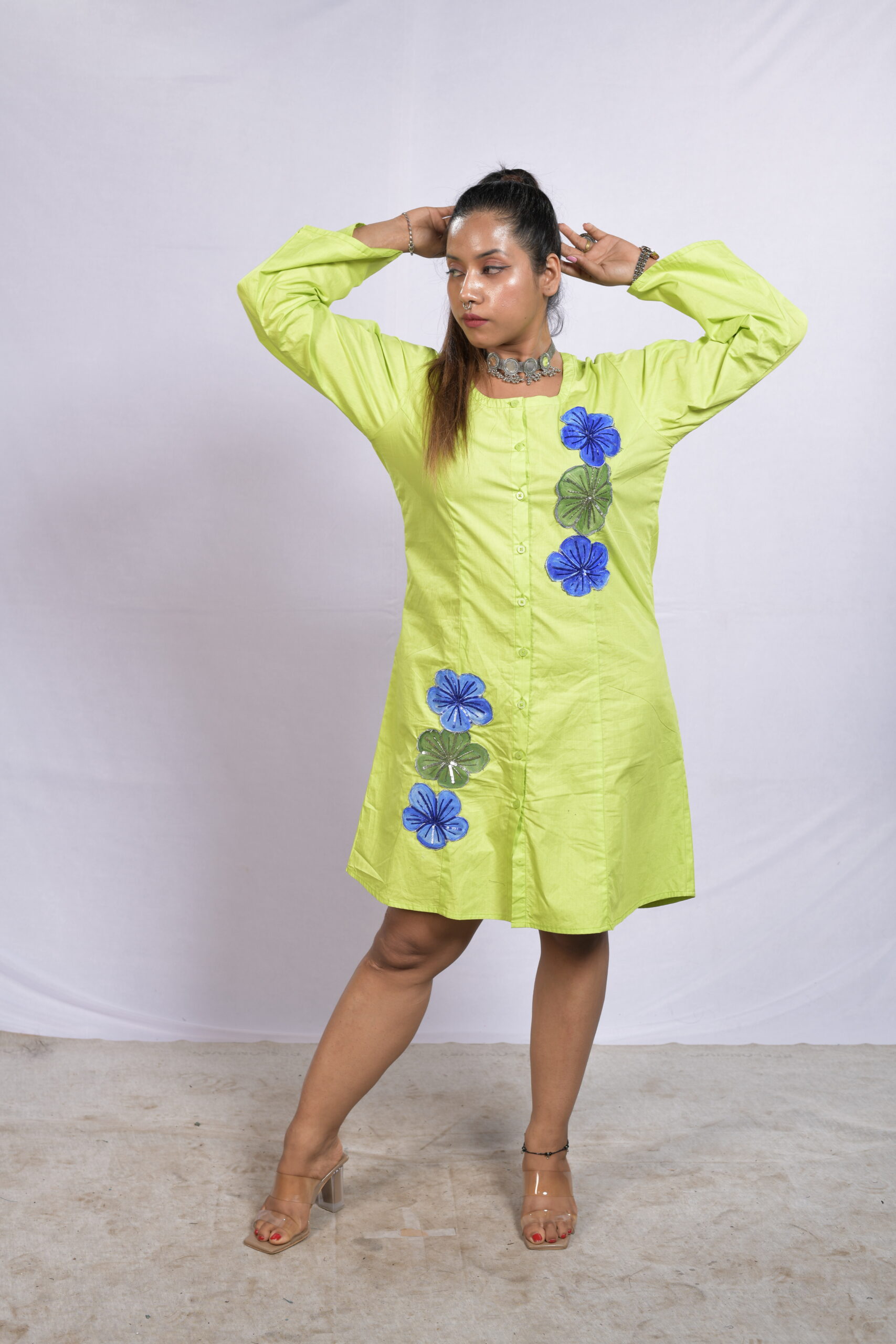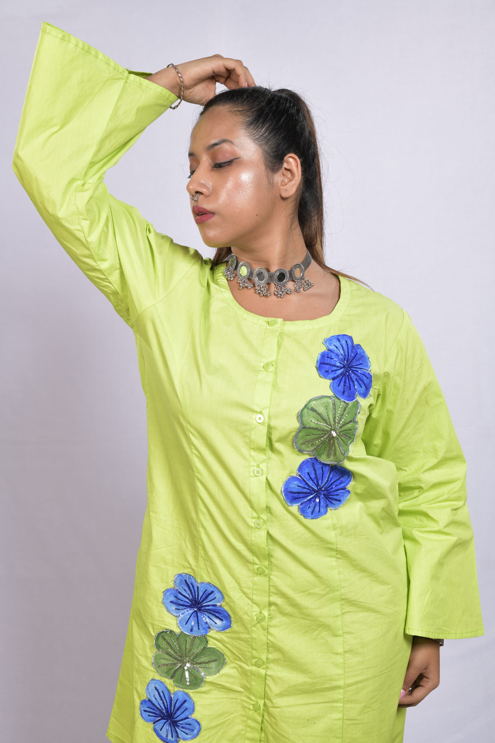 A breezy lime green cotton shirt dress with handcrafted blue floral detailing — designed by Aanujj Kapoor for effortless everyday charm.