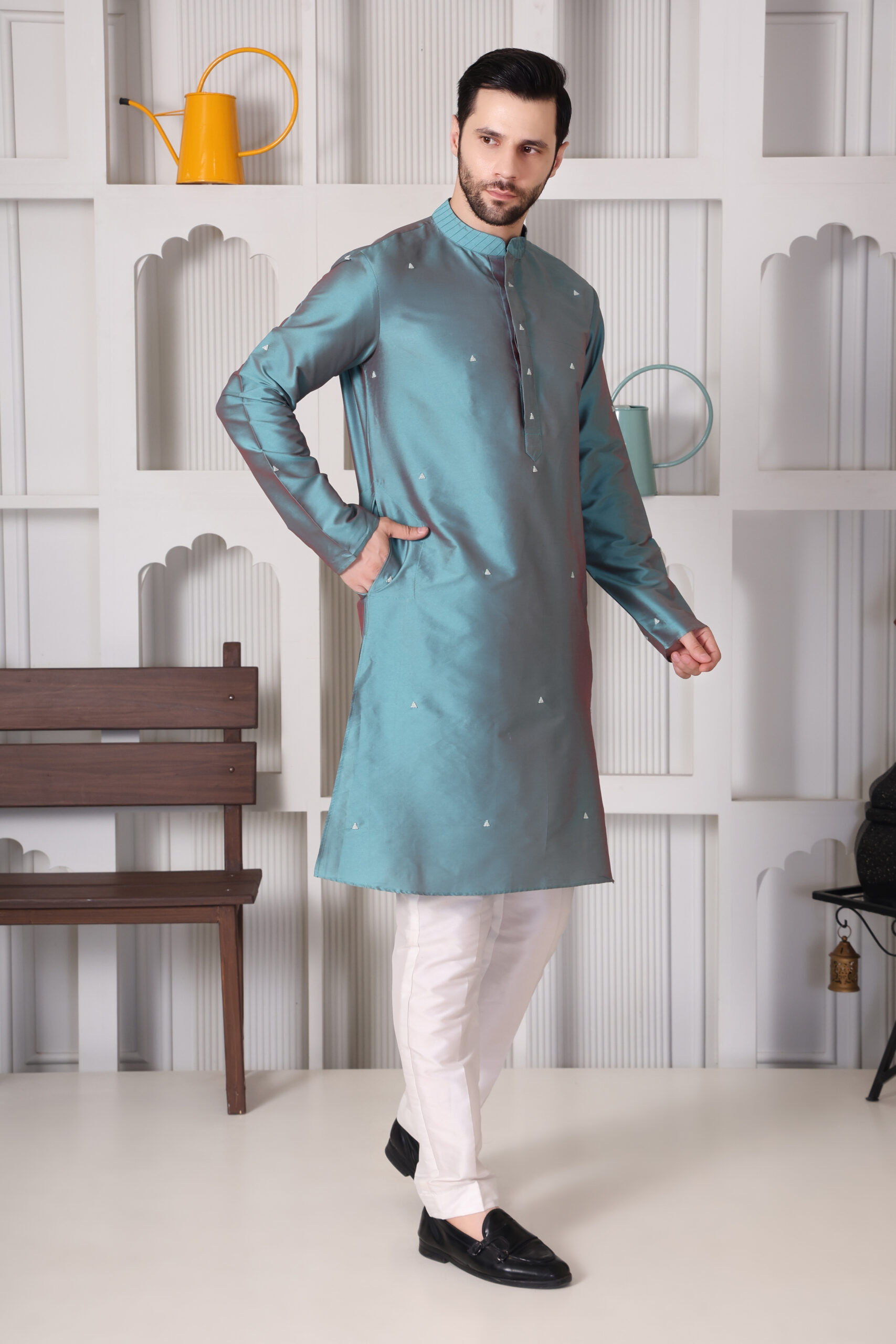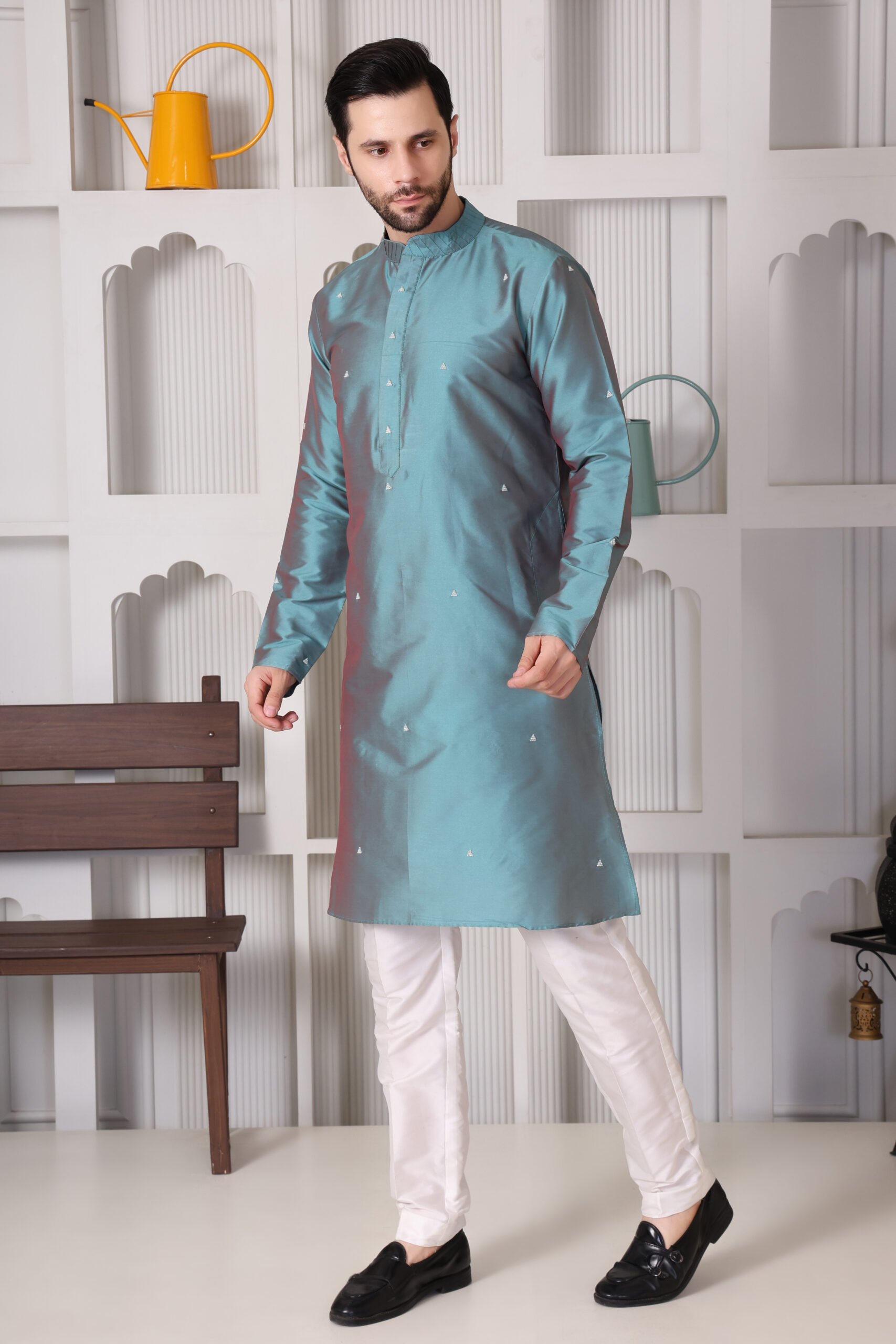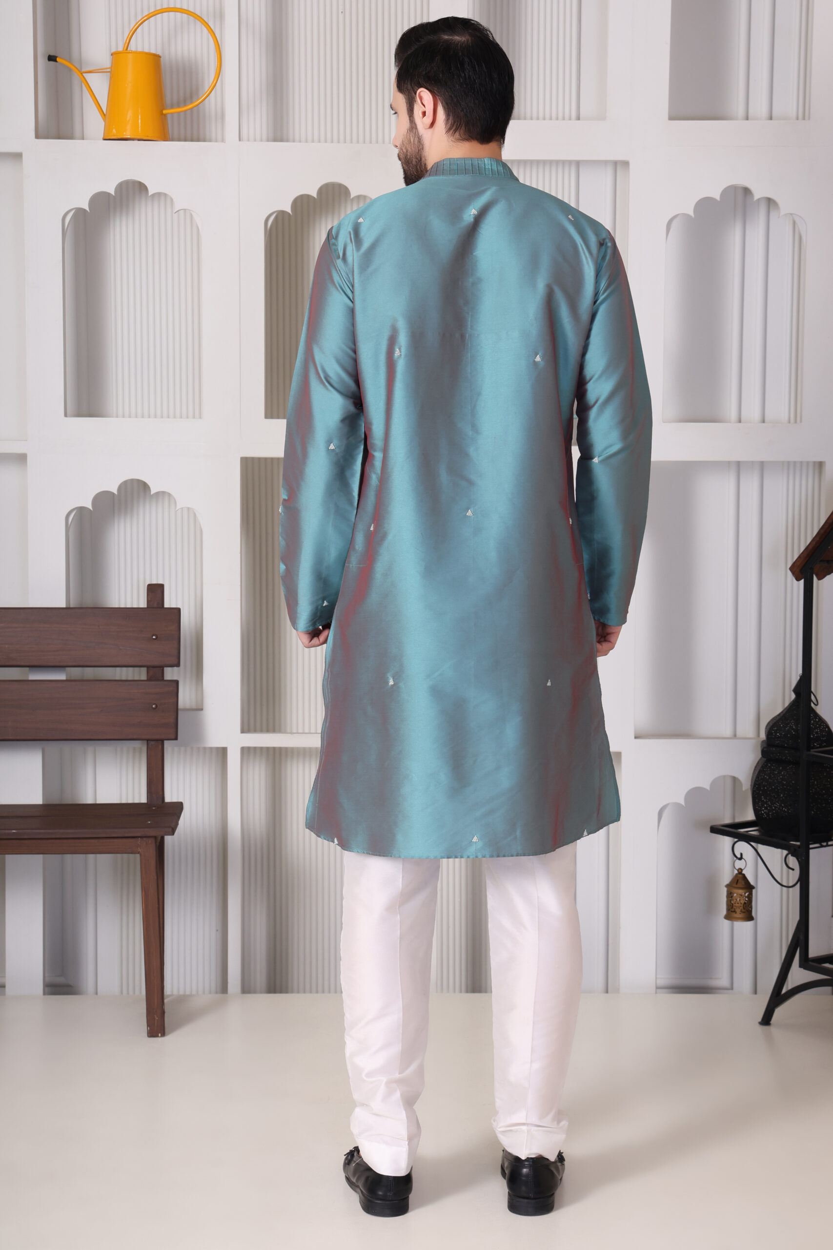 Crafted from premium art silk, this teal blue minimal embroiderd kurta by Aanujj Kapoor features subtle embroidered motifs and a clean, elegant design — perfect for festive and semi-formal occasions.